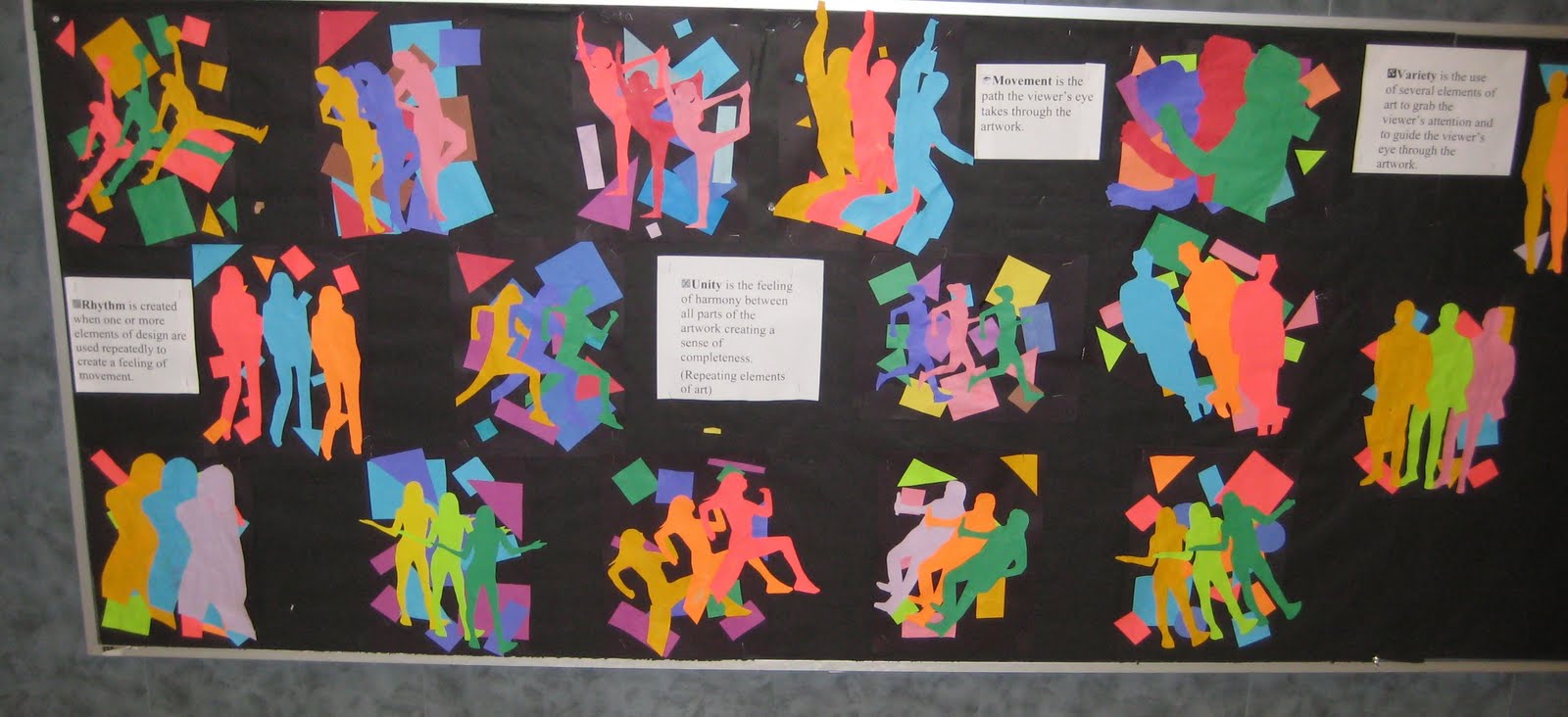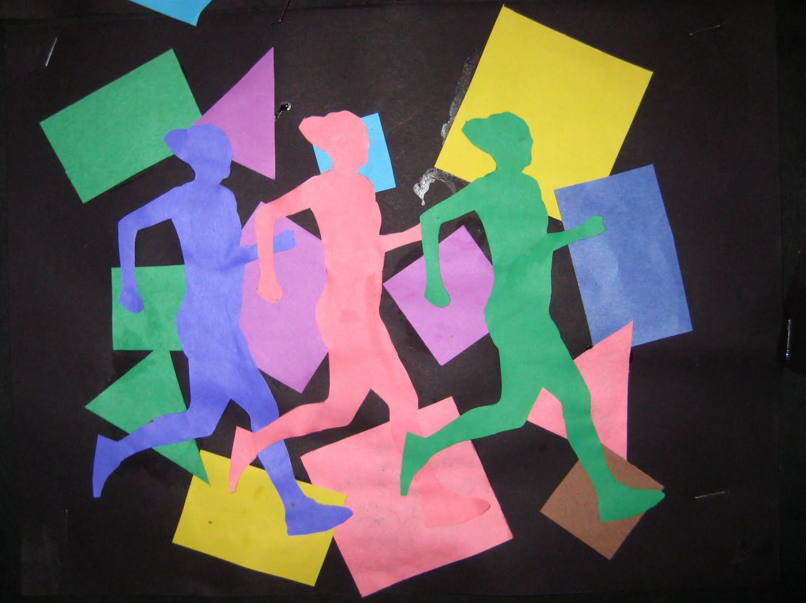 Step 7: Glue the three people shapes onto the composition. Make sure to use overlap and use either diagonal or curved movement from the arrangement of the people.