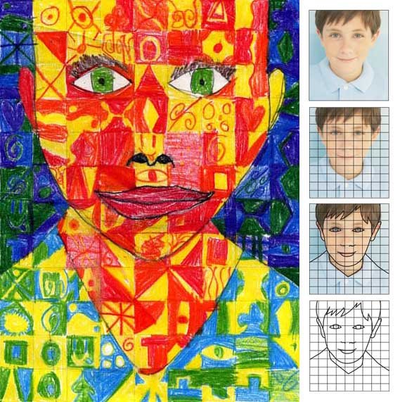 3. Once the face edge lines are on the grid paper, instruct the students to pick a pair of pencil crayons each for the face, neck, background and hair. Each square in these areas is to be filled with any kind of shapes and patterns, but only with the chosen pair of colors. Repeat until all the areas are filled. The eyes look best just colored normally without any patterns.